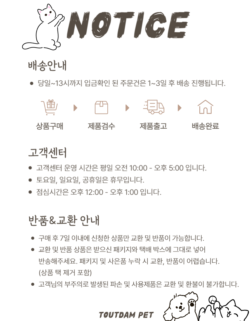 - 기본 배송기간 이상 소요되는 상품이거나, 품절 상품은 개별 연락을 드립니다.